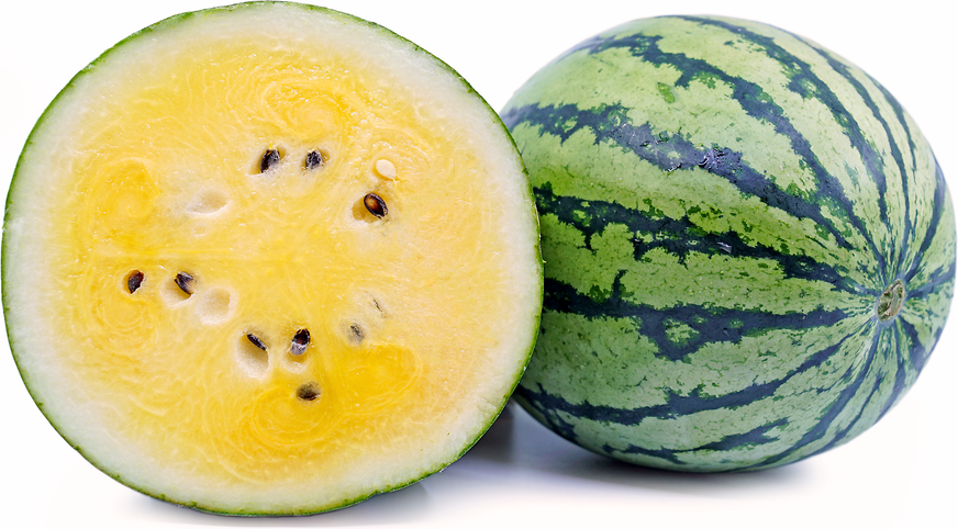 Yellow WatermelonYellow watermelons widely vary in size, depending on the specific variety, but are generally smaller than red-fleshed varieties. The oblong to oval fruits have a thick, smooth, and hard green rind, covered in dark to light green mottling and striping.