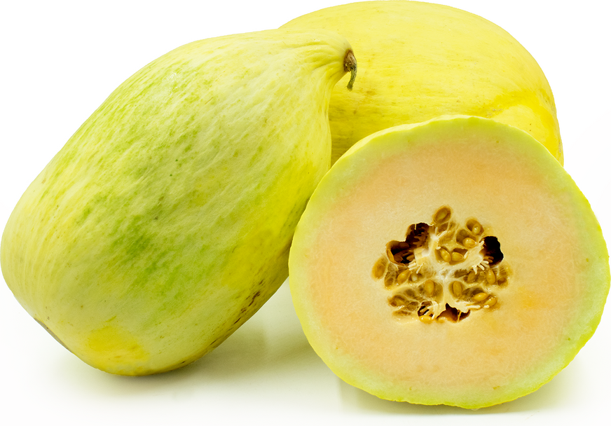 Casaba MelonsOvoid to round shape that comes to a point at its stem. When ripe, its skin will be a golden yellow with hints of green throughout. Its thick, hard rind has irregular shallow furrows running from end to end. The creamy pale green to white flesh is mildly sweet with nuances of Asian pear and cucumber.