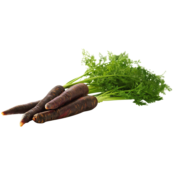 Marroon Bunch CarrotsWine coloured baby carrots with green tops still attached.