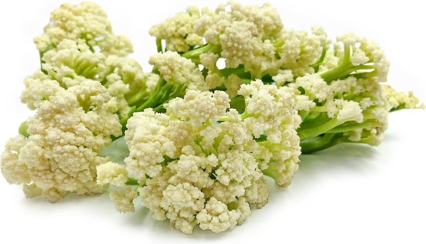 Florentino Baby CauliflowerLong green stems with cream-coloured, open florets growing in bunches at the tops. The heads are firm, with a few large, cabbage-like leaves growing around them. The entirely edible stems and flowers offer a succulent texture and sweet, nutty flavour.