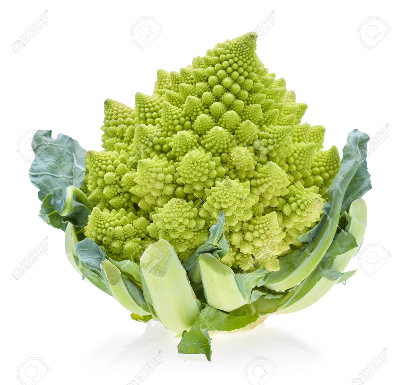 Romanesco CauliflowerThis pale green vegetable tastes like a cross between Broccoli and Cauliflower. Its unique growth pattern creates ornate spirals.