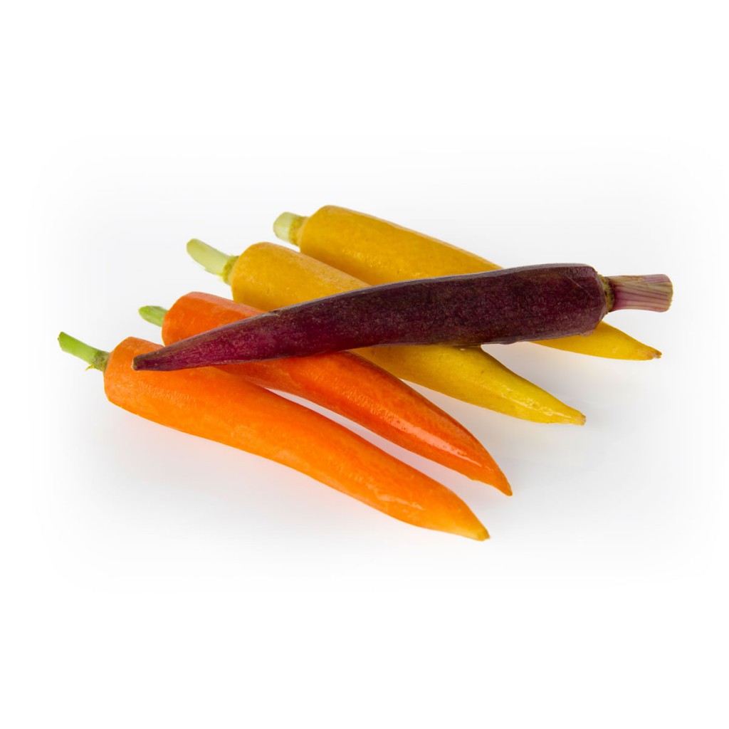 Baby Mini Cello Multi-Coloured CarrotsBaby Mini Cello Multi-Coloured Carrots, comprised of organic yellow, orange and purple baby carrots.