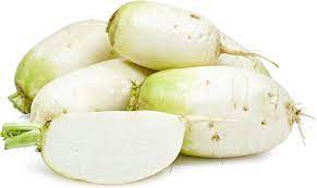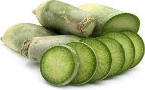 Green Oriental RadishThick skin covers a green to creamy white flesh which offers a crisp texture and a radish flavour that can vary from mild to hot depending upon growing conditions and maturity.