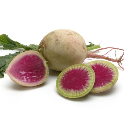 Valentine (Watermelon) RadishAlso called Valentine Radish. Pale whitish green skin gives way to a bright pink to magenta interior. Tender-crisp, succulent and slightly peppery.