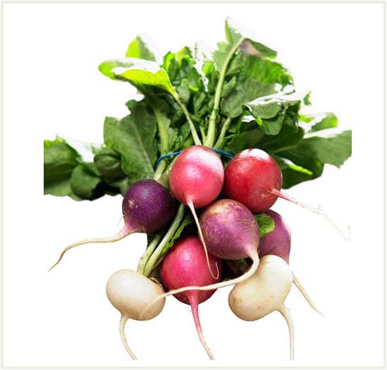 Easter Egg RadishPetite and round with thin wiry taproots. Colours range from white to pink to crimson to purple, all in one bunch.
