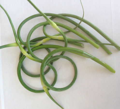 Garlic ScapesThe long, curvy stem and flower bud which the garlic plant shoots up in its second year of growth. Harvested before it goes into bloom.